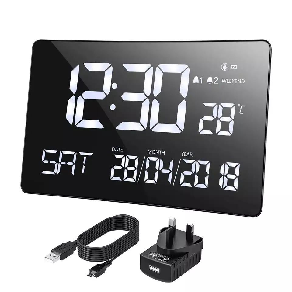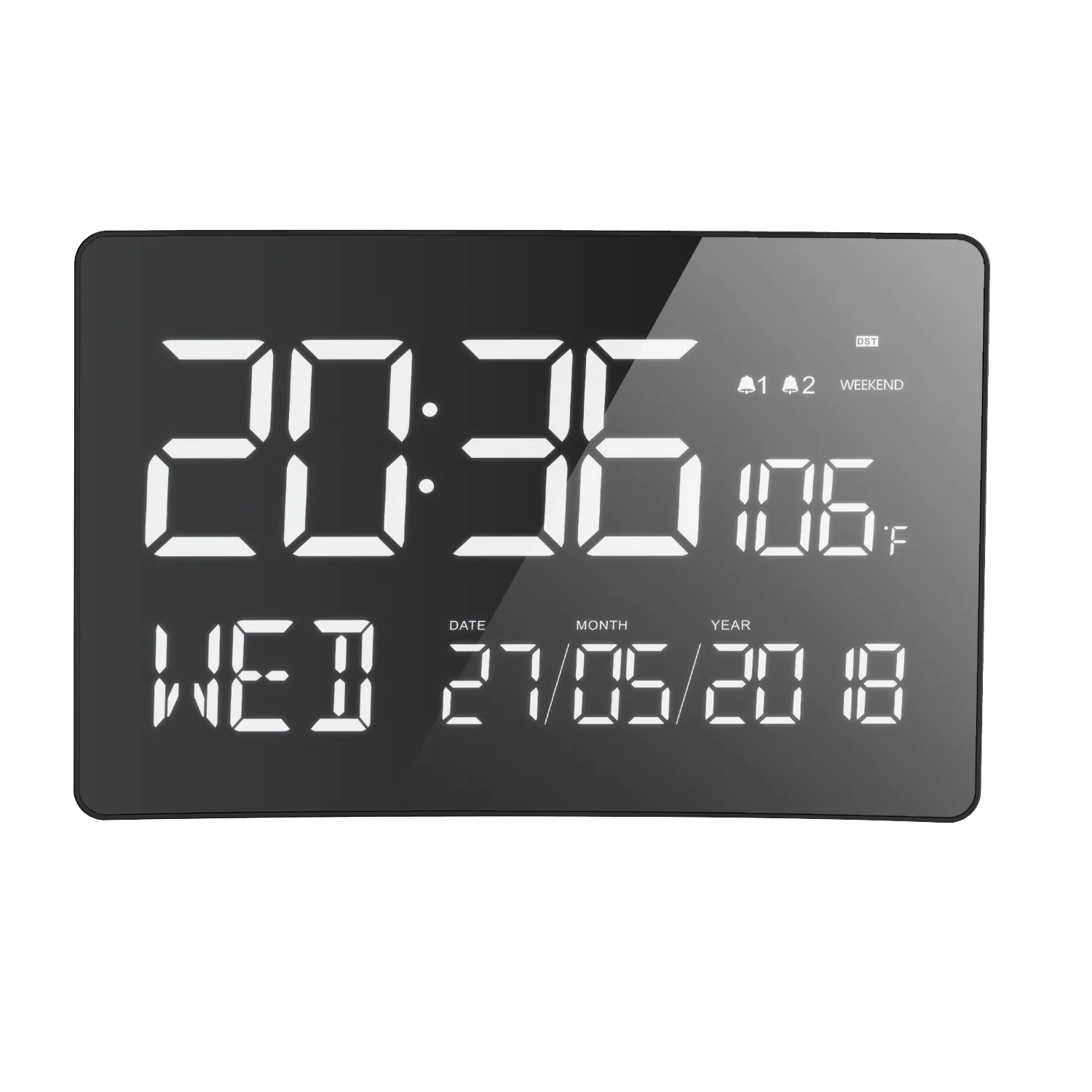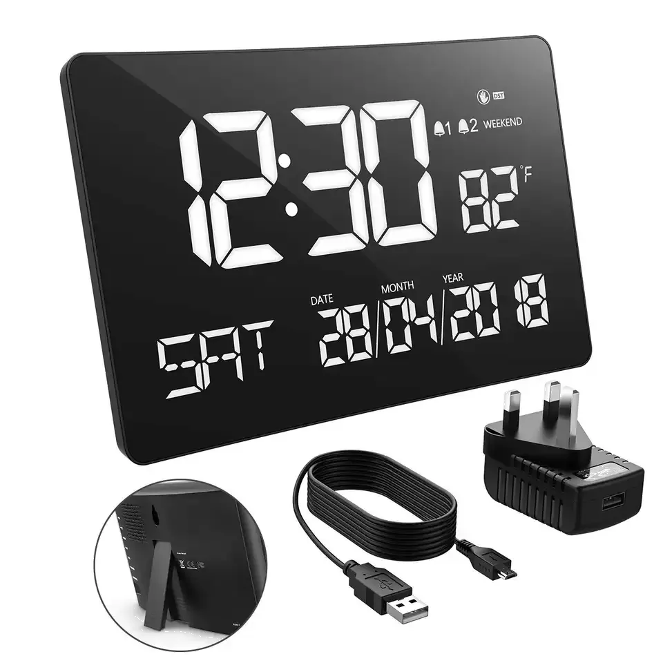 Jam alarm kalender digital LED 11 Inci LED Layar Lengkung Meja dan Jam Dinding ini tidak hanya memiliki tampilan alarm waktu, tetapi juga tampilan suhu. Font layar besar membuat orang melihat dengan jelas, beberapa penyesuaian kecerahan untuk periode waktu yang berbeda. Jam kalender hari waktu tampilan alarm ganda dan jam dinding digital suhu yang dapat diisi ulang untuk ruang tamu.