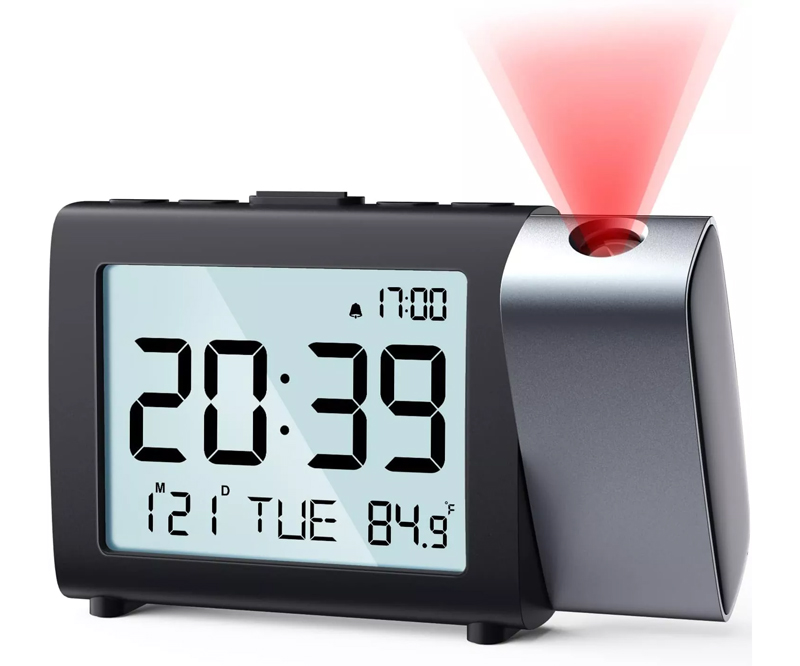 Prinsip jam proyeksi terutama bergantung pada teknologi proyeksi, yang menampilkan waktu dengan memproyeksikan informasi waktu ke dinding atau permukaan lainnya. Secara khusus, jam proyeksi menggunakan lampu bulat LED merah terang untuk menerangi layar LCD putih terbalik, yang menampilkan informasi waktu. Kemudian, informasi waktu diperbesar dan diproyeksikan ke dinding melalui dua lensa cembung. Kejelasan dapat dicapai dengan menyesuaikan jarak antara dua lensa cembung.